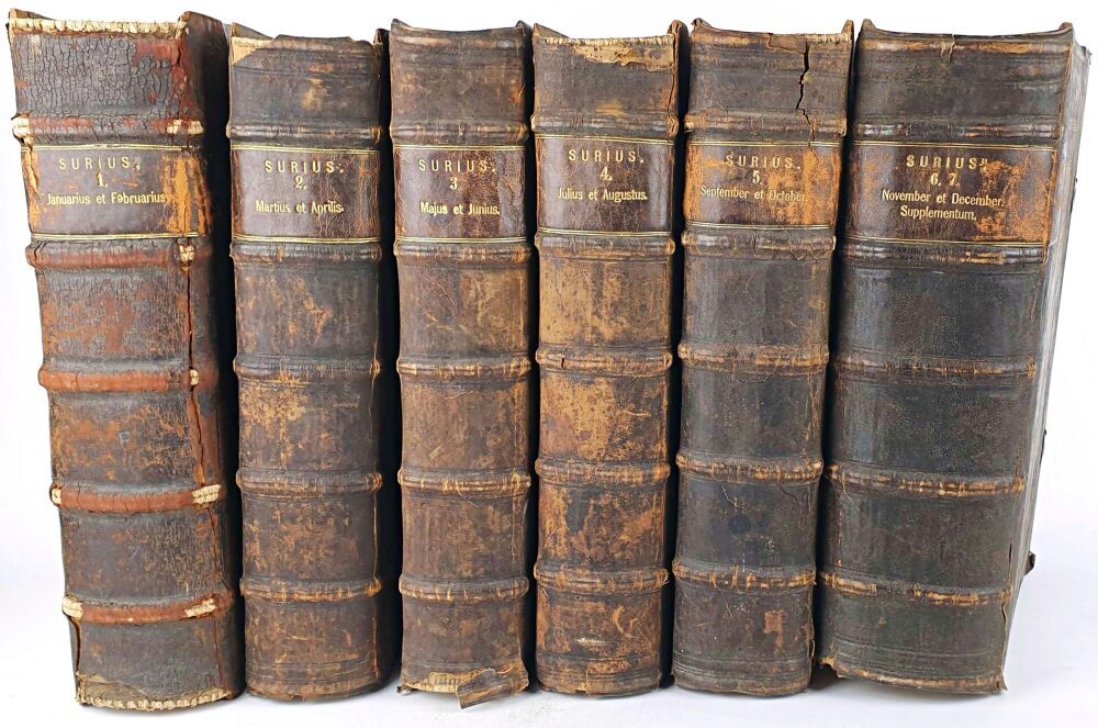 [Piotr Skarga - Żywoty Świętych] Surius - De Probatis Sanctorum. T. I-VI plus Suplement (komplet) 1570, poznańska renesansowa oprawa radełkowa z wizerunkami świętych, introligator Mc lub Melchior Nering